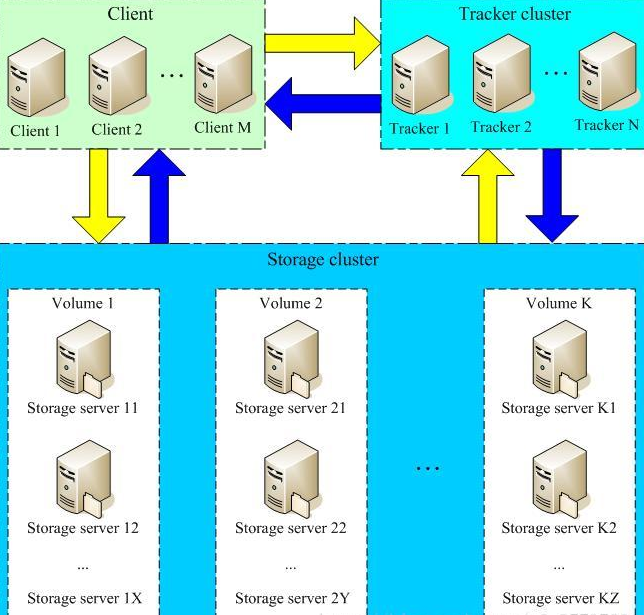 为了支持大容量,存储节点(服务器)采用了分卷(或分组)的组织方式。存储系统由一个或多个卷组成,卷与卷之间的文件是相互独立的,所有卷 的文件容量累加就是整个存储系统中的文件容量。一个卷可以由一台或多台存储服务器组成,一个卷下的存储服务器中的文件都是相同的,卷中的多台存储服务器起 到了冗余备份和负载均衡的作用。