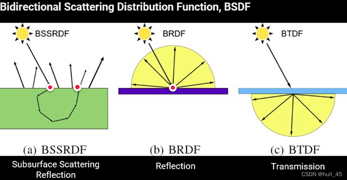 你可能听说过中间的BRDF,它描述了光打在物体表面某一点,又从该点重新出射的情况;左边的BSSRDF则是光的出射点不同于入射点;而BTDF则是光从另一面出射了。真实情况下,这三种现象都会发生,它们统称为BSDF。我们人为地将它们划分为这三类,方便列公式,并且在有的时候舍弃掉其中的某些部分,用来加速计算。比如unity中的standard pbr shader只能表达BRDF,这对一般的硬表面是够用的,而到了大理石、牛奶、皮肤、树叶这种材质时,BSSRDF和BTDF的视觉效果变得很明显,我们不能再忽视掉它。