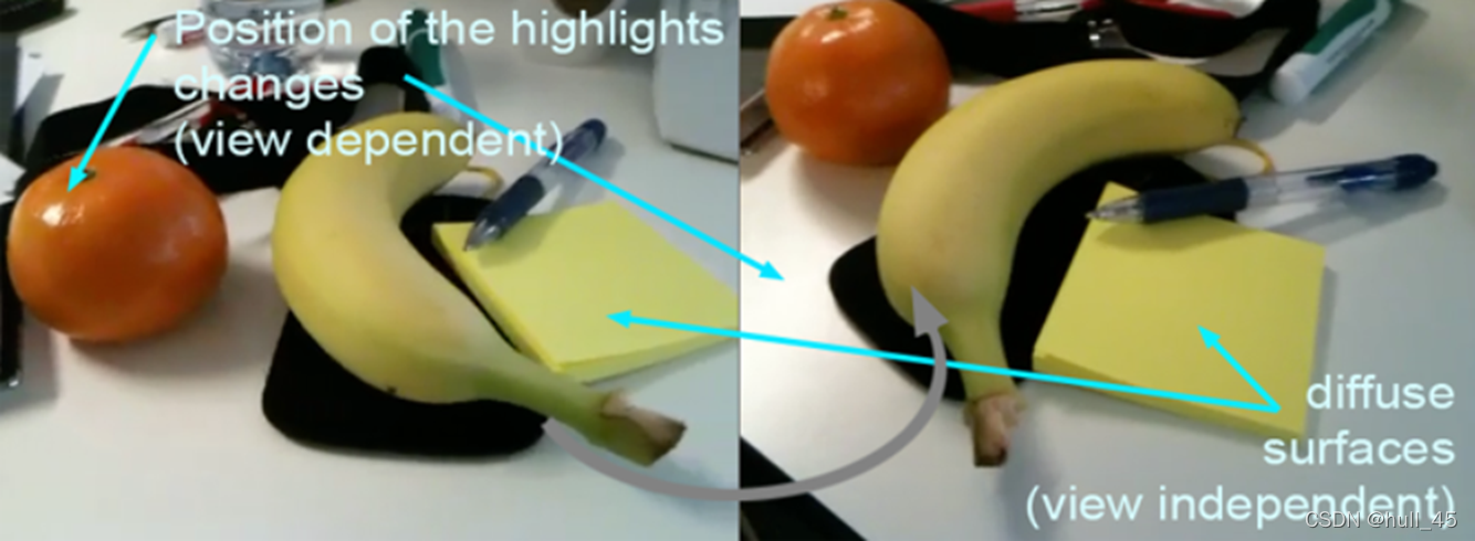我们插播一段话解释一下漫反射和高光反射,不需要可以跳过。在图形学中我们经常将光照结果分为漫反射(diffuse)和高光反射(specular)两类,两者的和是最终的颜色。高光反射就是我们日常所说的高光点,它的本质是说高光反射值和视线(或光线)方向有直接关系,光或者你转了方向,高光点的位置也会发生改变。相对的,漫反射则表示不随视线(或光线)方向变化而明显变化的光照。