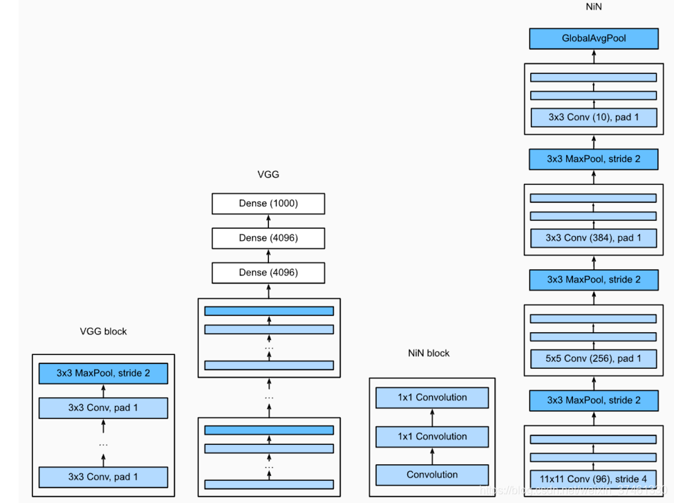 NiN:串联多个由卷积层和“全连接”层构成的小⽹络来构建⼀个深层⽹络。
