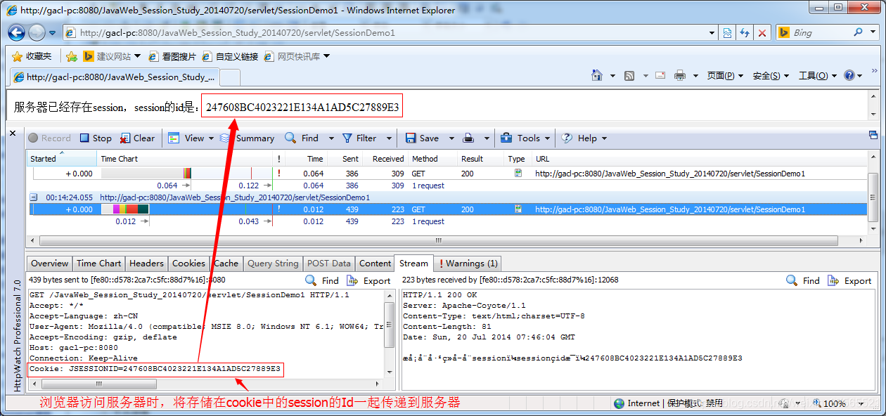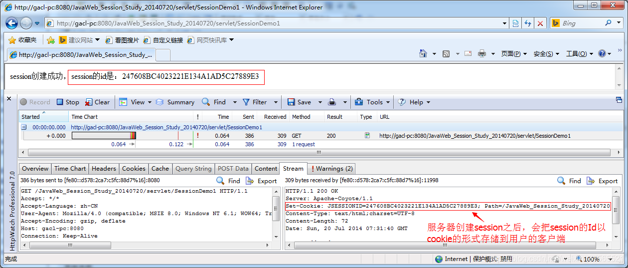 第一次访问时,服务器会创建一个新的sesion,并且把session的Id以cookie的形式发送给客户端浏览器,如下图所示: