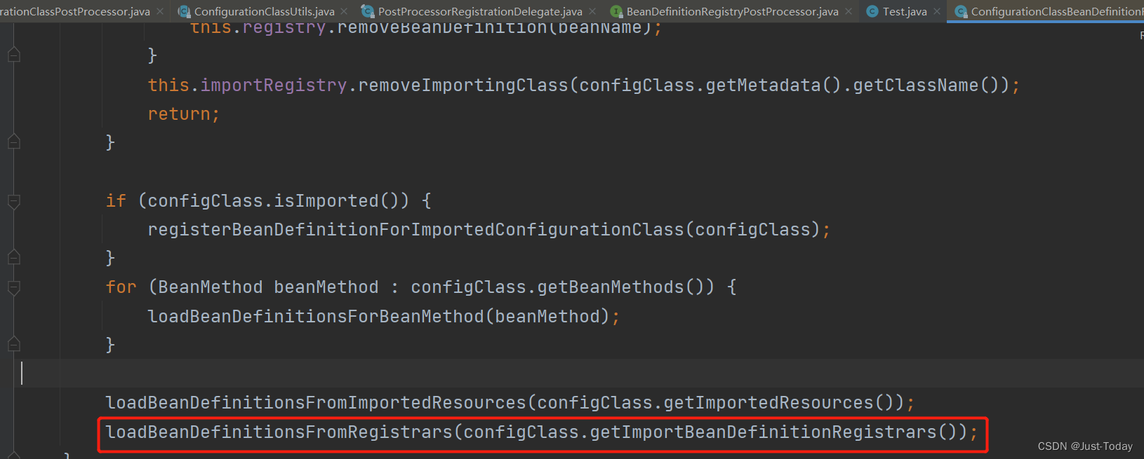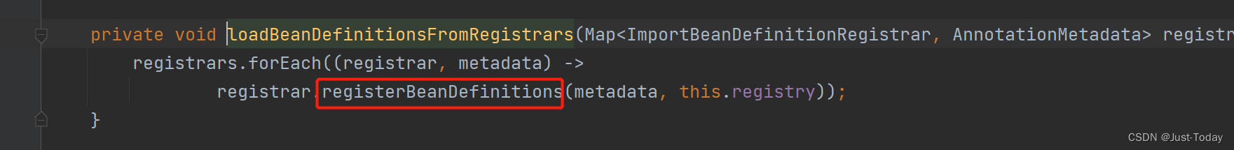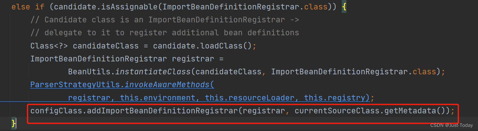 调用loadBeanDefinitionsForConfigurationClass方法的loadBeanDefinitionsFromRegistrars方法运行当前类的importBeanDefinitionRegistrars集合的registerBeanDefinitions方法