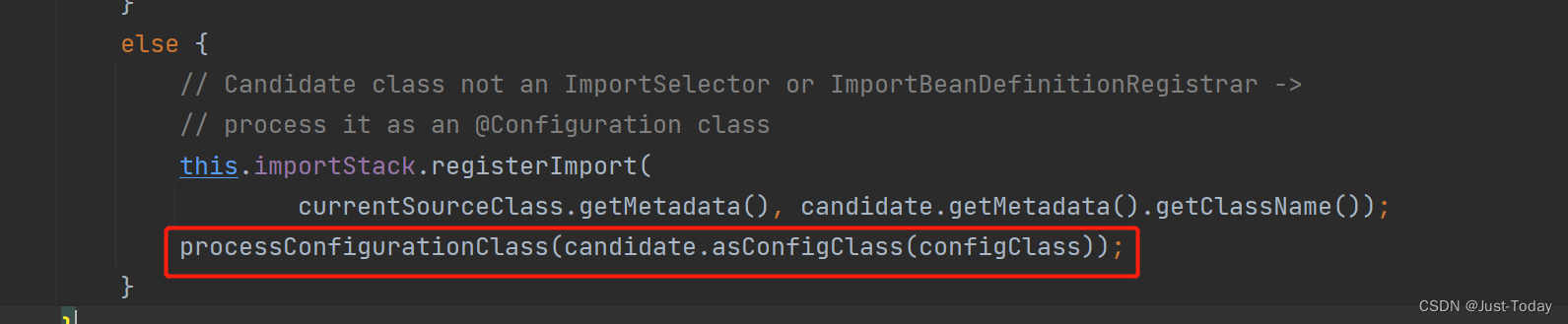 当前value都没实现ImportSelector、ImportBeanDefinitionRegistrar接口时,将它当成一个配置类继续调用processConfigurationClass方法解析该配置类