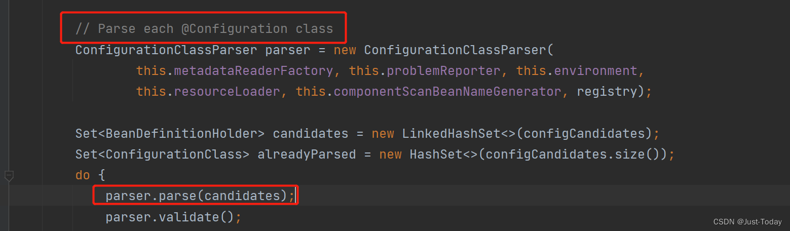 processConfigBeanDefinitions方法创建ConfigurationClassParser对象去解析@Configuration配置类的信息,包括解析注解@Import信息