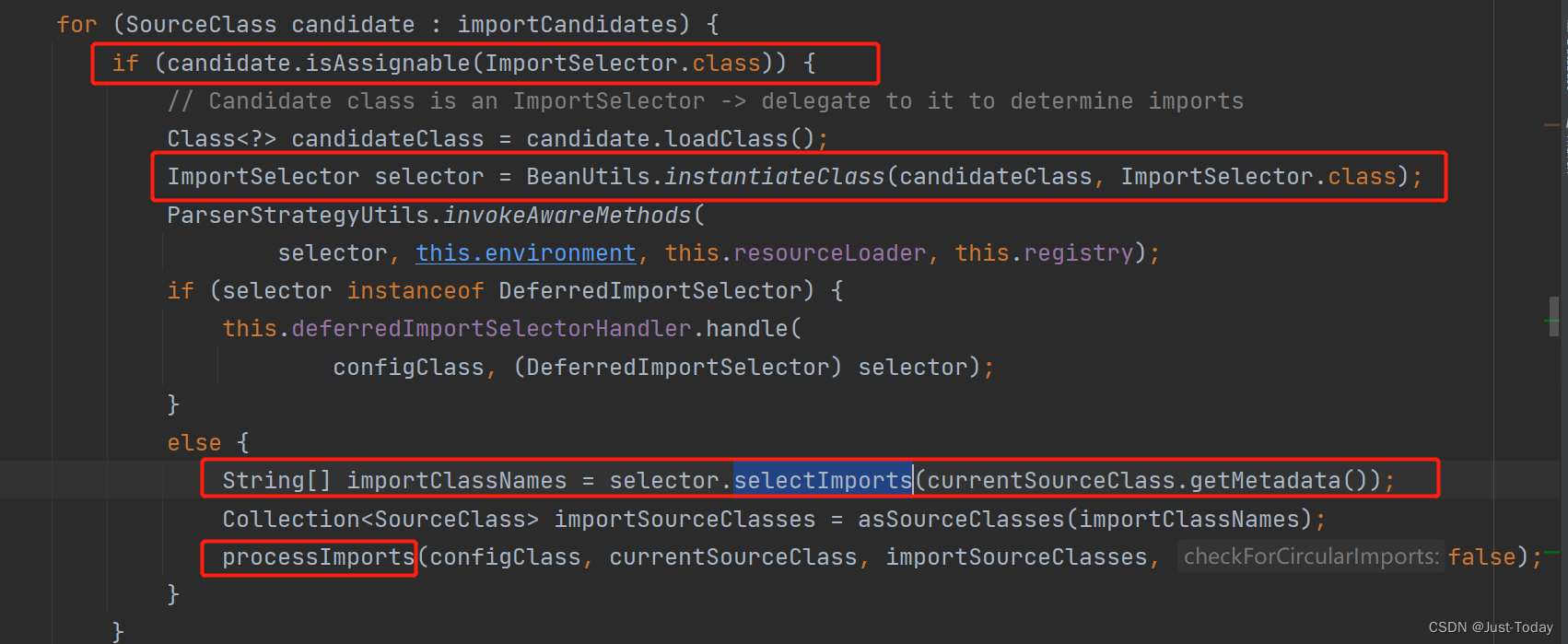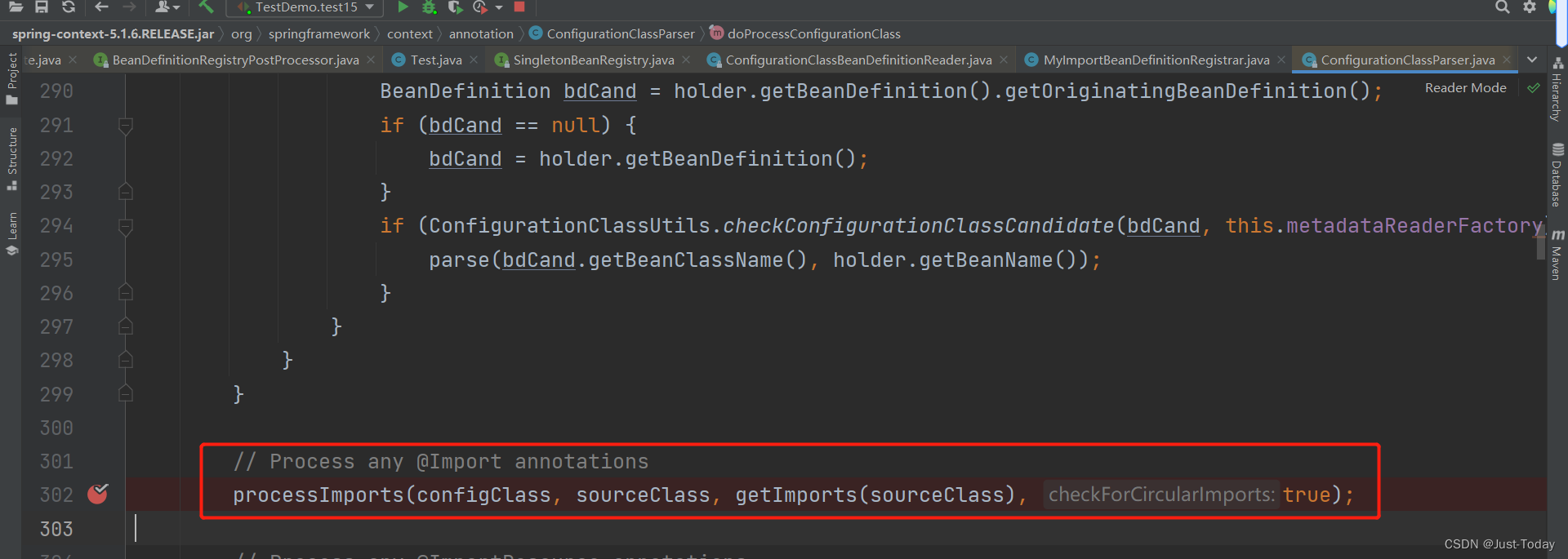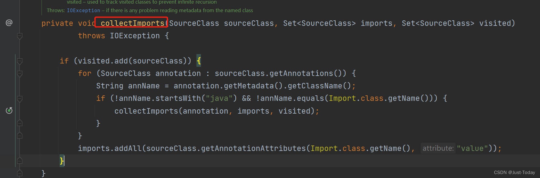 定位到如图processImports方法,该方法就是实际用来解析@Import注解
