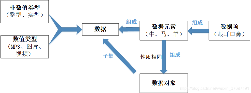数据对象:是性质相同的数据元素的集合,是数据的子集