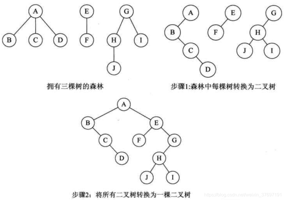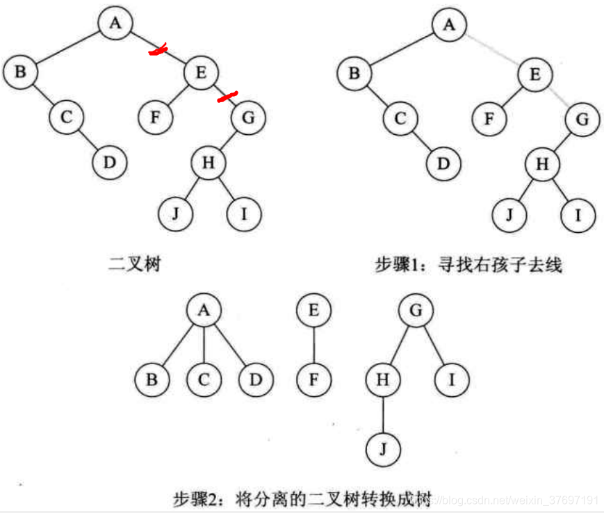 判断一棵二叉树能够转换为一棵树还是森林,只需看这颗二叉树的根结点有没有右孩子,有就是森林,没有就是一棵树。转换成森林的步骤如下: