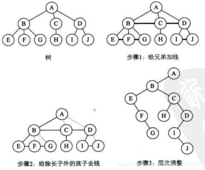 - 去线。对树中的每个结点,只保留它与第一个孩子结点的连线,删除它与其它孩子结点之间的连线。