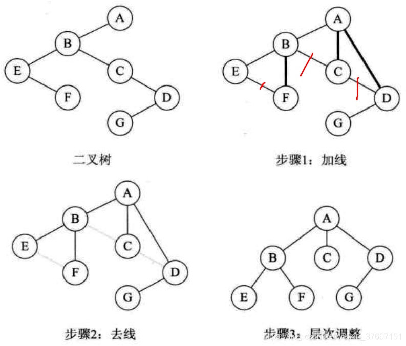 - 加线。若某结点的左孩子结点存在,则将这个左孩子的所有右孩子结点都作为此结点的孩子。将该结点与这些右孩子结点用线连接起来。