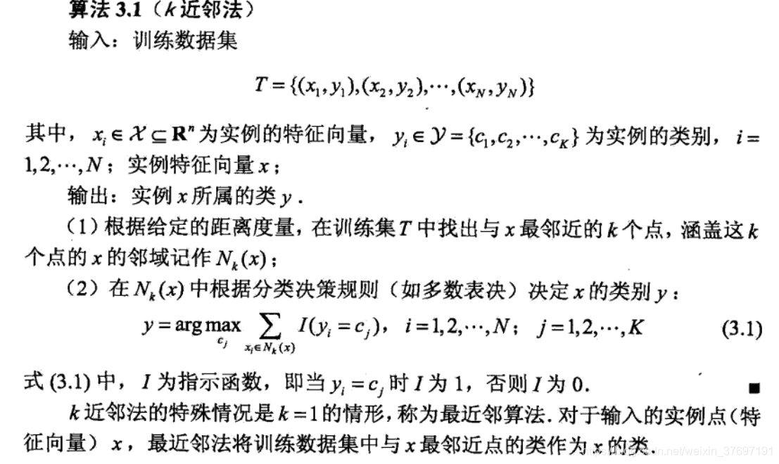 分类时,对于新的实例来说,通过计算与训练实例的距离,来得到K个最近邻的训练实例的类别,通过多数表决等方式进行预测(实际就是那种类别多,就预测为那种类别)。所以KNN的三要素为:K值的选择、距离度量、分类决策规则。