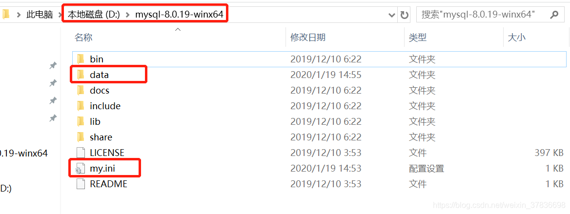 下载完成后,将压缩包解压到安装目录(我是放在盘目录了),之后在D:\mysql-8.0.19-winx64目录下新建my.ini文件和data文件夹
