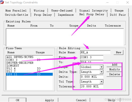 如果需要添加的net比较少或是担心把不相关的网络添加进来或是PIN PAIR的输入输出弄错了,也可以一个个去添加PIN PAIR,再创建MATCH GROUP,这个方法后面再介绍具体的步骤。