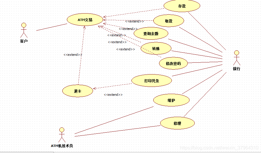 - 客户:使用ATM进行业务操作,包括余额查询、存款、取款、转账和修改密码等。;