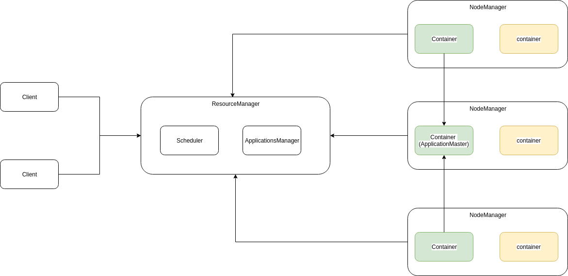 - NodeManager 管理很多容器,容器中运行着正真的分布式计算程序,比如flink,或者spark。NodeManager需要向ResourceManager上报自己的任务运行情况,同时向ResourceManager发起资源申请