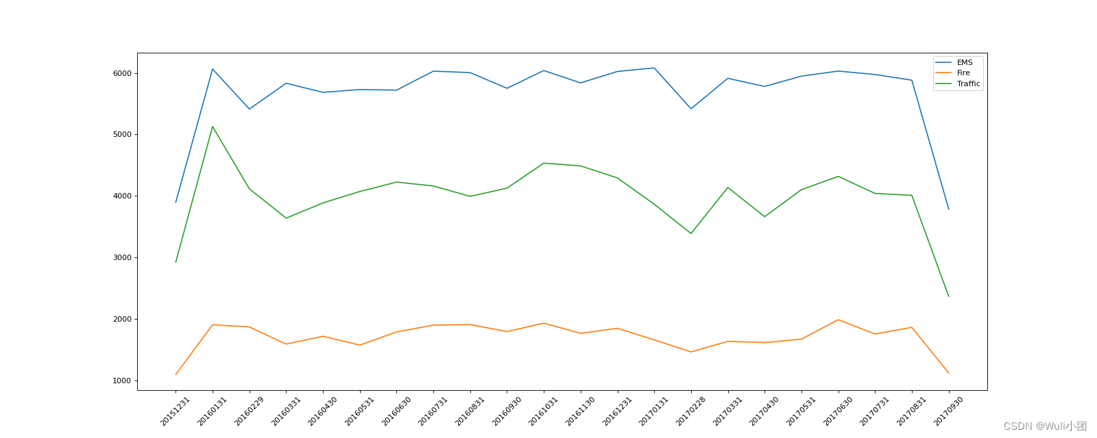 # coding=utf-8 #911数据中不同月份不同类型的电话的次数的变化情况 import pandas as pd import numpy as np from matplotlib import pyplot as plt #把时间字符串转为时间类型设置为索引 df = pd.read_csv("./911.csv") df["timeStamp"] = pd.to_datetime(df["timeStamp"]) #添加列,表示分类 temp_list = df["title"].str.split(": ").tolist() cate_list = [i[0] for i in temp_list] # print(np.array(cate_list).reshape((df.shape[0],1))) df["cate"] = pd.DataFrame(np.array(cate_list).reshape((df.shape[0],1))) df.set_index("timeStamp",inplace=True) print(df.head(1)) plt.figure(figsize=(20, 8), dpi=80) #分组 for group_name,group_data in df.groupby(by="cate"): #对不同的分类都进行绘图 count_by_month = group_data.resample("M").count()["title"] # 画图 _x = count_by_month.index print(_x) _y = count_by_month.values _x = [i.strftime("%Y%m%d") for i in _x] plt.plot(range(len(_x)), _y, label=group_name) plt.xticks(range(len(_x)), _x, rotation=45) plt.legend(loc="best") plt.show()[1 rows x 9 columns] DatetimeIndex(['2015-12-31', '2016-01-31', '2016-02-29', '2016-03-31', '2016-04-30', '2016-05-31', '2016-06-30', '2016-07-31', '2016-08-31', '2016-09-30', '2016-10-31', '2016-11-30', '2016-12-31', '2017-01-31', '2017-02-28', '2017-03-31', '2017-04-30', '2017-05-31', '2017-06-30', '2017-07-31', '2017-08-31', '2017-09-30'], dtype='datetime64[ns]', name='timeStamp', freq='M') DatetimeIndex(['2015-12-31', '2016-01-31', '2016-02-29', '2016-03-31', '2016-04-30', '2016-05-31', '2016-06-30', '2016-07-31', '2016-08-31', '2016-09-30', '2016-10-31', '2016-11-30', '2016-12-31', '2017-01-31', '2017-02-28', '2017-03-31', '2017-04-30', '2017-05-31', '2017-06-30', '2017-07-31', '2017-08-31', '2017-09-30'], dtype='datetime64[ns]', name='timeStamp', freq='M') DatetimeIndex(['2015-12-31', '2016-01-31', '2016-02-29', '2016-03-31', '2016-04-30', '2016-05-31', '2016-06-30', '2016-07-31', '2016-08-31', '2016-09-30', '2016-10-31', '2016-11-30', '2016-12-31', '2017-01-31', '2017-02-28', '2017-03-31', '2017-04-30', '2017-05-31', '2017-06-30', '2017-07-31', '2017-08-31', '2017-09-30'], dtype='datetime64[ns]', name='timeStamp', freq='M')
