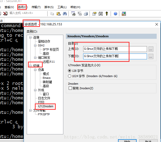 在SecureCRT.exe 上选择 ->选项->会话->终端->X/Y/Zmodem