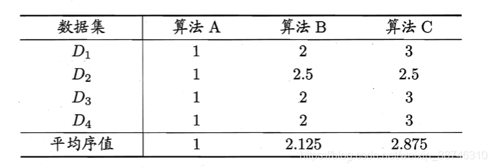 假定我们用 D1D_1D1、D2D_2D2 、D3D_3D3 和 D4D_4D4 四个数据集对算法 AAA、BBB、CCC 进行比较。首先需要得到每个算法在每个数据集上的测试结果,可以是准确率,也可以是均方误差,然后在每个数据上根据测试性能的好坏进行排序,并赋予序值 1,2,…。如果算法的测试性能相同,则评分排名。比如,在 D1D_1D1 和 D3D_3D3 上,AAA 最好、BBB 次之,CCC 最差,而在 D2D_2D2 上 AAA 最好、BBB 和 CCC 性能相同,…,则可以列出如下表所示的序值表,对每一列的序值进行求平均,得到平均序值。