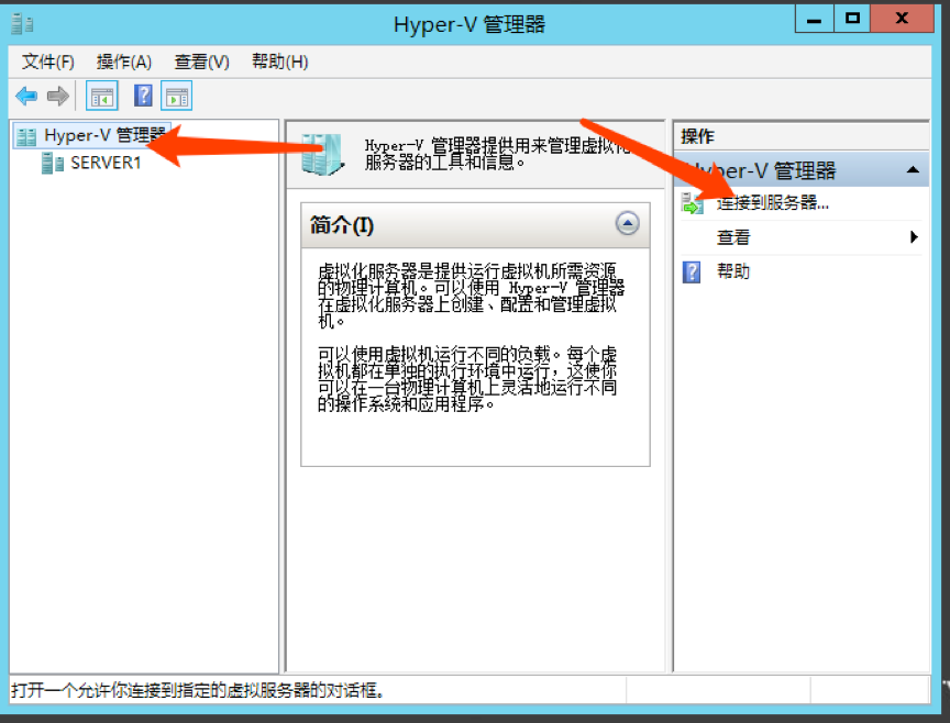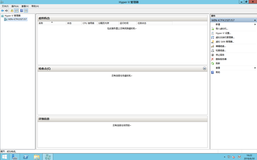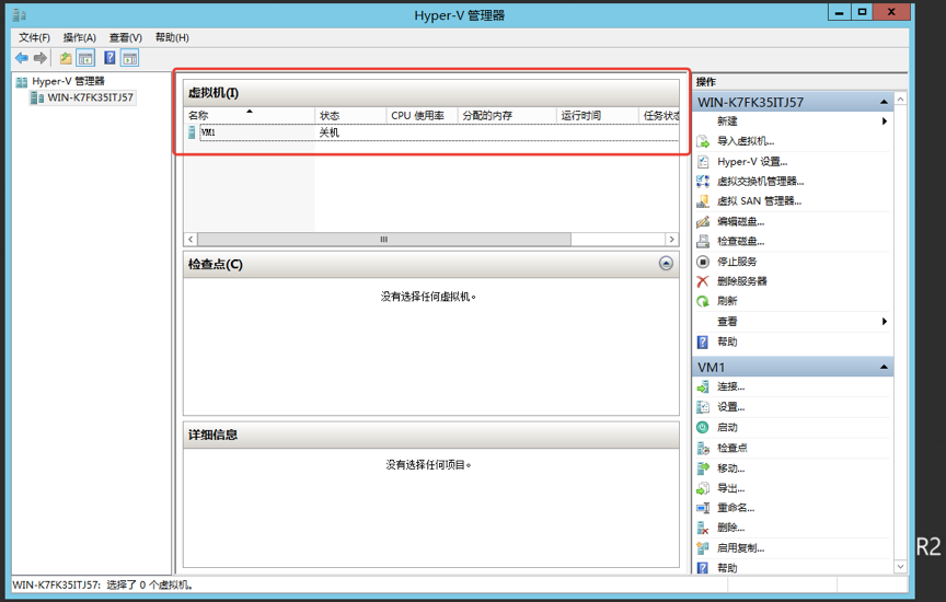 (2)以下窗口就是Hyper-V管理器,左侧区域为Hyper-V主机列表,在这里可以管理本地Hyper-V主机,也可以远程连接到其他Hyper-V主机,但需提前配置好网络和权限。中间区域为虚拟机列表,可以点击某一台虚拟机进行相应的操作、配置。右侧区域为配置区域,可以对Hyper-V主机和虚机进行相应操作配置。