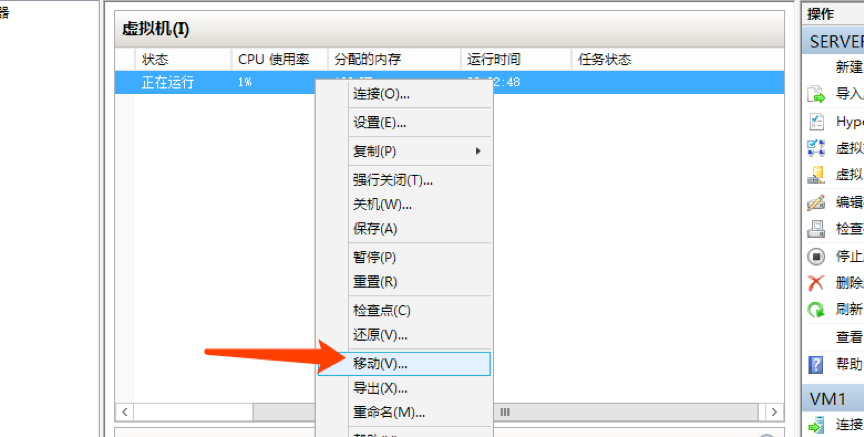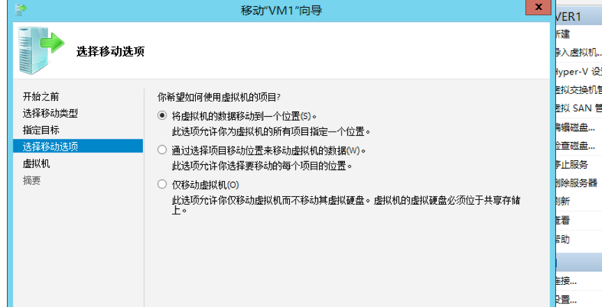 (3)移动选项:建议选择“将虚拟机的数据移动到一个位置”。执行移动。此时观察虚拟机状态会发现虚拟机并没有中断。虚拟机迁移速度取决于网络质量,而存储迁移由于是在本地不同位置迁移,相对会更加快速,二者都不会造成虚拟机中断。