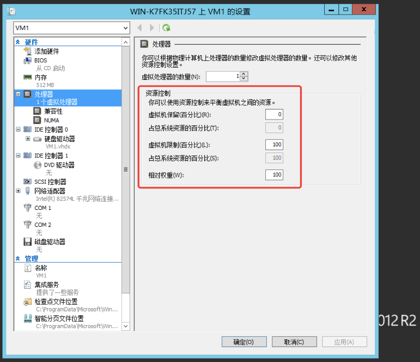 评估完成后掌握了所需资源的具体数据,接下来进行Hyper-V资源配置。通过以下操作打开CPU资源分配具体设置页:右击虚拟机,选择“虚拟机设置”,在“虚拟机设置”的选项中,在弹出的“处理器”页面中,可以设置虚拟机的虚拟处理器的数量、虚拟机保留(百分比)、占总系统资源的百分比、虚拟机限制和相对权重等。