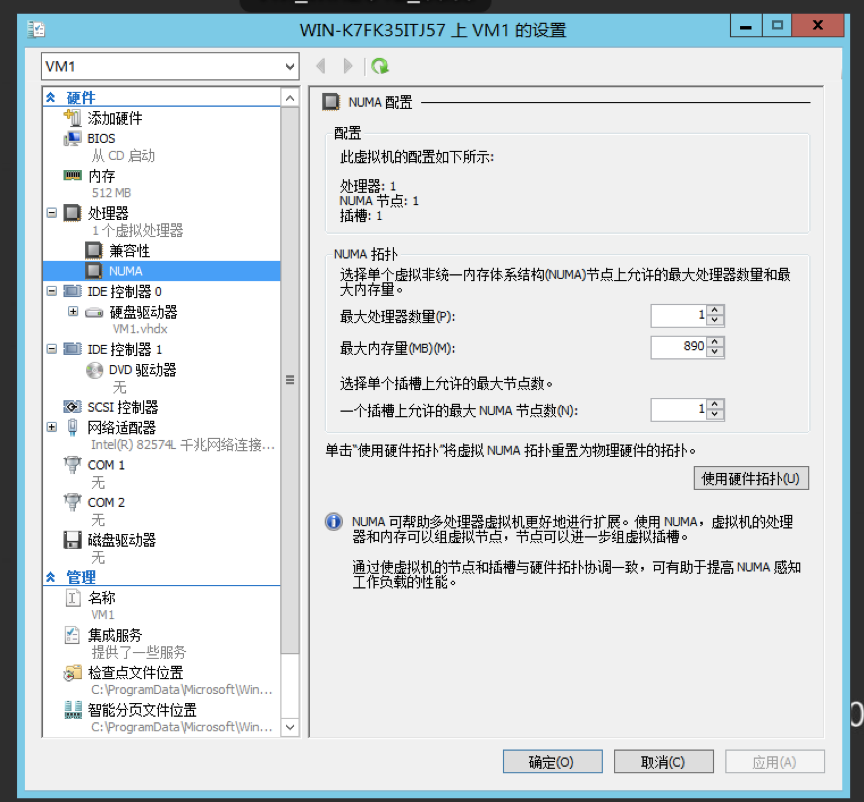 关于Hyper-V处理器设置还有两个比较重要的设置项:CPU 兼容性和NUMA(非一致性内存访问)。下面具体说明二者的功能: