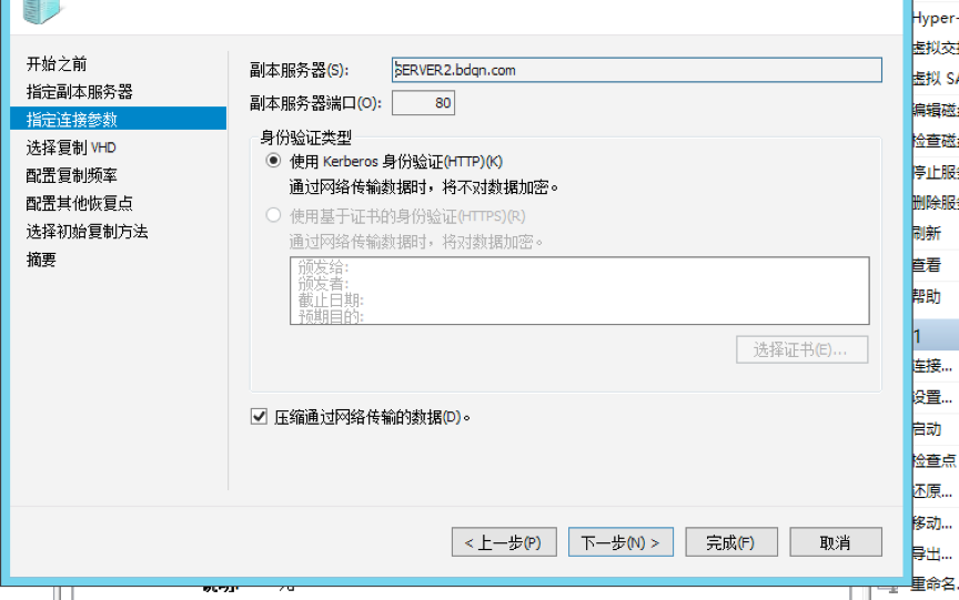 注:“压缩通过网络传输的数据”可以将数据压缩后传递节省传输时间,但压缩过程消耗Hyper-V 服务器资源,一般情况下可以勾选