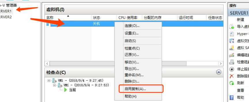 计划的故障转移——设置反向复制使位于数据中心DC1中的 Hyper-V1变成副本服务器,位于DC2中的 Hyper-V2 变成主服务器。(具体设置方法参考部署步骤1和步骤2)