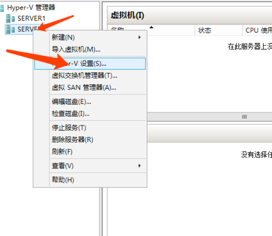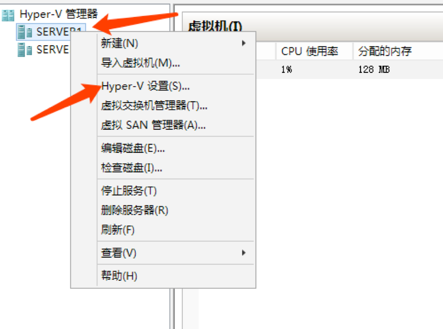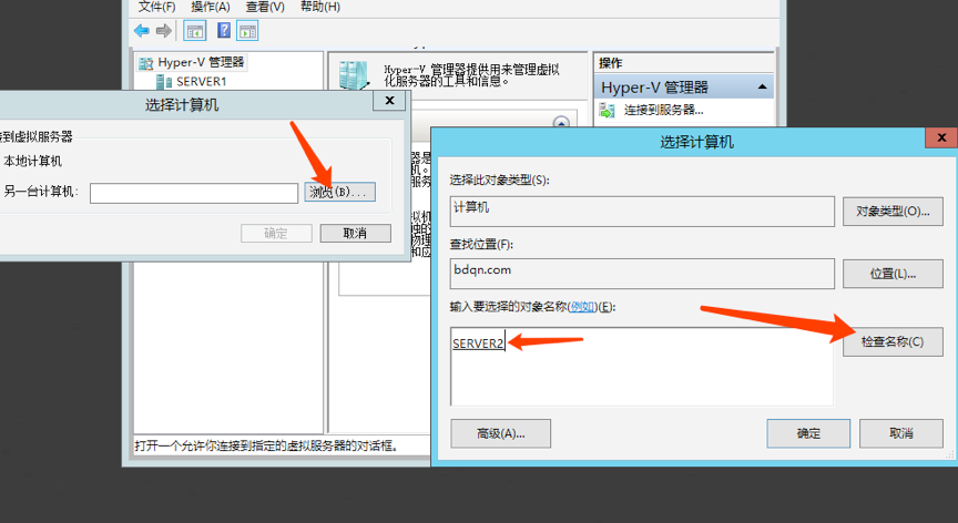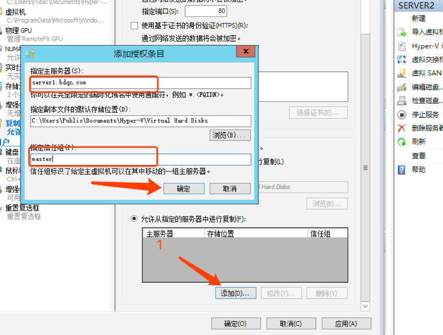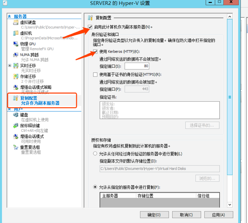 (1) 使用Hyper-V管理器分别连接Hyper-V1主机和Hyper-V2 主机。在Hyper-V2 主机的Hyper-V设置中,添加允许Hyper-V1 进行复制。