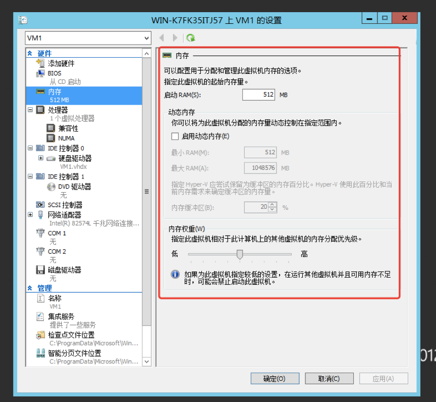 如果有10台虚拟机同时向Hyper-V主机申请内存,虚拟机内存权重越高,申请内存越快。