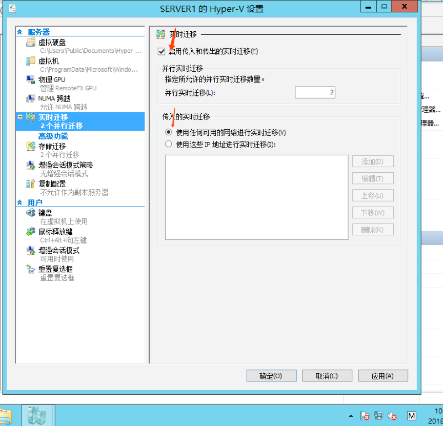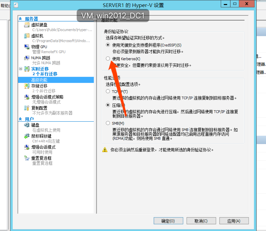 (2) 启用传入、传出实时迁移。配置Hyper-V 主机网络连接,身份验证协议,CredSSP/Kerberos。一般Hyper-V 主机都加入域,所以用Kerberos传入实时迁移。在另外一个Hyper-V主机– Hyper-V 设置, 勾选Kerberos 认证。