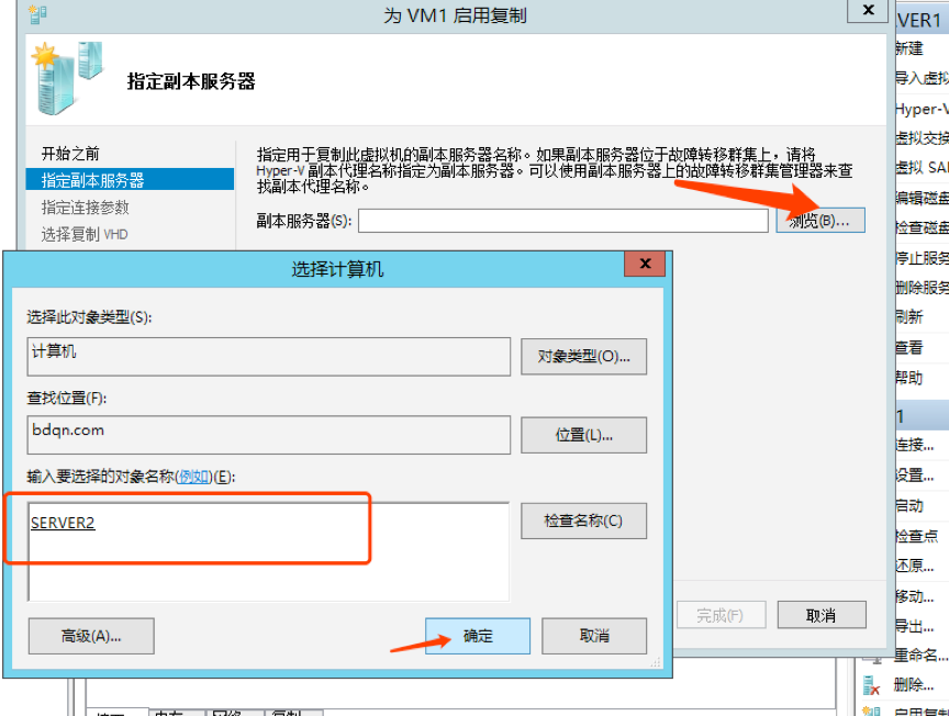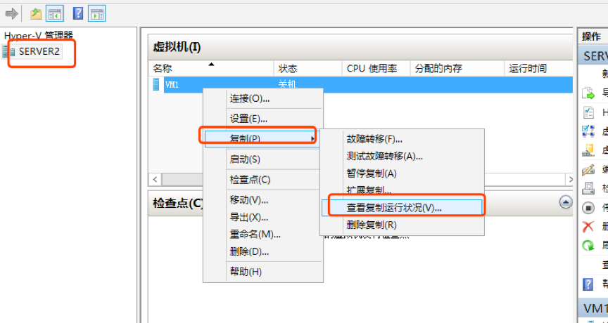 (3) 在Webserver 上点击复制,选择副本服务器,选择Hyper-V2,下一步