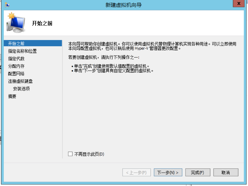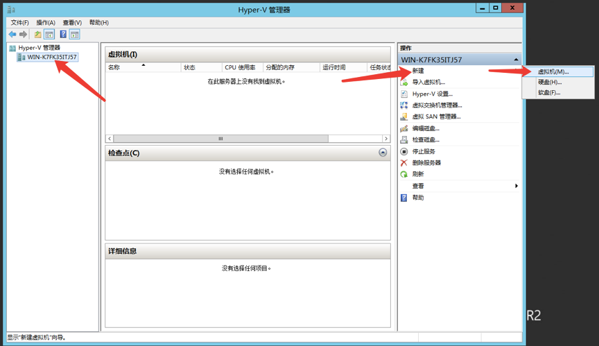 (3)点击左侧的Hyper-V主机,右侧区域选择“创建”可以触发一个新建虚拟机的向导,根据向导创建一台新的虚拟机。