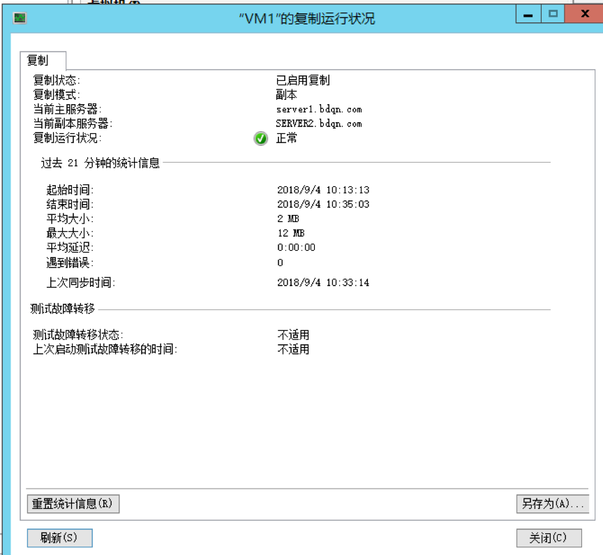 测试——测试功能会在副本服务器Hyper-V2上额外生成一台新的测试虚拟机,如果测试虚拟机功能正常说明复制操作是正常工作的。此时测试虚拟机不会接受任何数据变更也不会有网络连接。完成测试后此测试虚拟机会被删除。