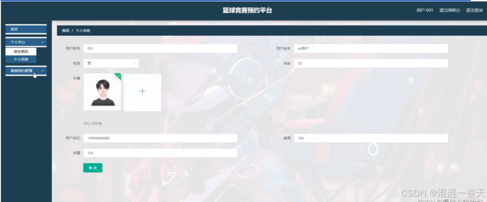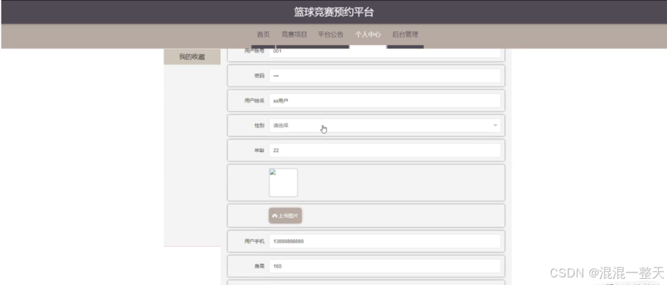 该系统为每一个用户都分配了一个用户账号,用户通过账号的登录可以在系统中查看篮球竞赛预约信息及对个人信息进行修改等功能。