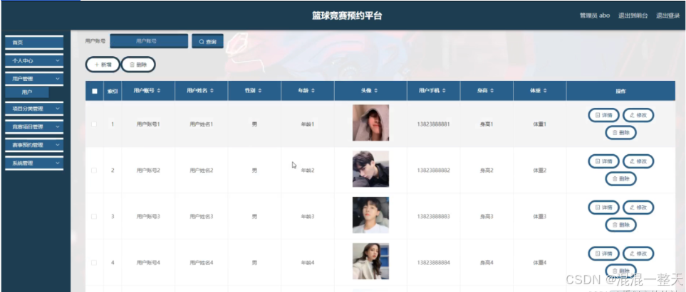 用户管理;在用户管理页面中可以查看索引,用户账号,用户姓名,性别,年龄,头像,用户手机,身高,体重等内容,并进行详情,修改和删除等操作