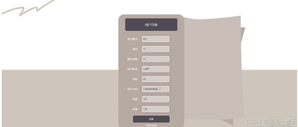 用户注册;在用户注册页面中输入用户账号,密码,确认密码,用户姓名,年龄,用户手机,身高,体重等内容进行用户注册操作