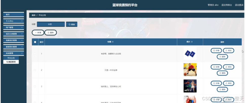 系统管理;在平台公告页面中可以查看索引,标题,图片等内容,并进行详情,修改和删除等操作;还可对轮播图管理进行详细操作