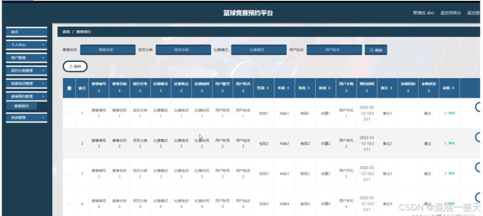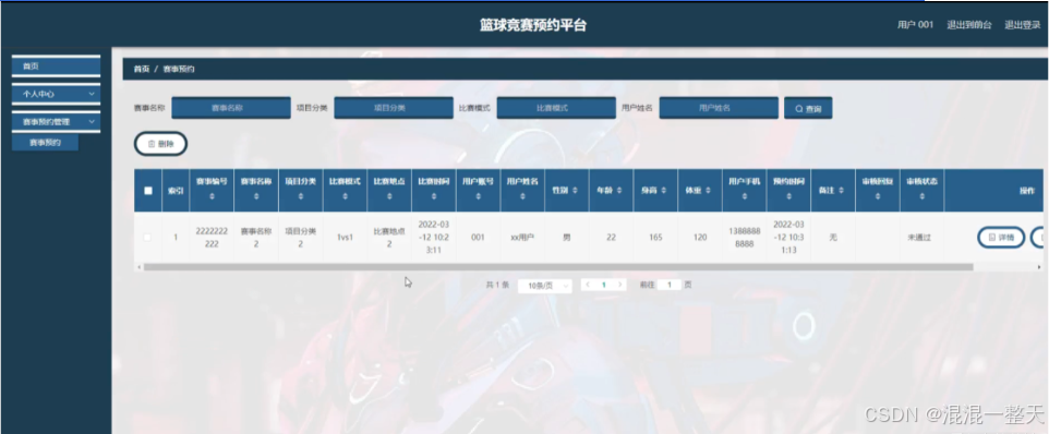 赛事预约管理;在赛事预约管理页面中可以查看索引,赛事编号,赛事名称,项目分类,比赛模式,比赛地点,比赛时间,用户账号,用户姓名,性别,年龄,身高,体重,用户手机,预约时间,备注,审核回复,审核状态等内容,并进行详情,删除等操作
