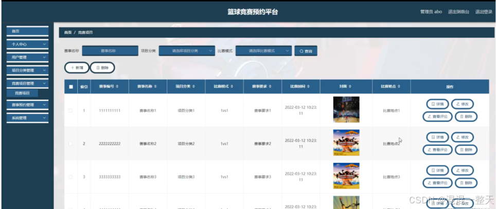 竞赛项目管理;在竞赛项目管理页面中可以查看索引,赛事编号,赛事名称,项目分类,比赛模式,比赛要求,比赛时间,封面,比赛地点等内容,并进行详情,修改和删除等操作