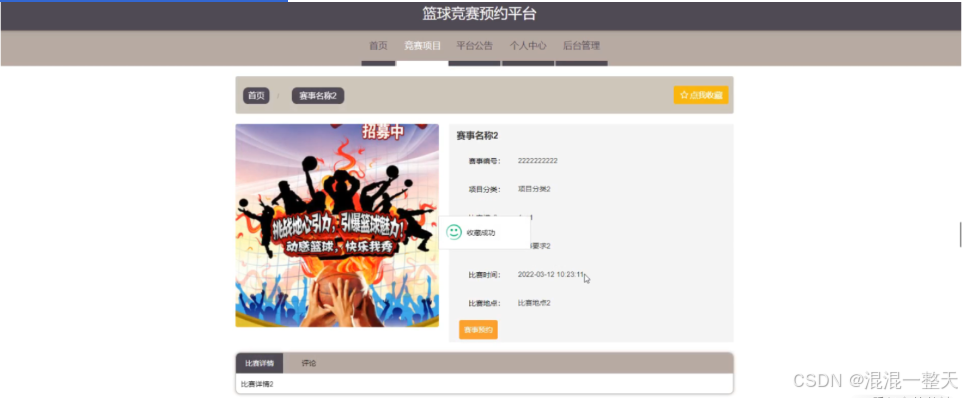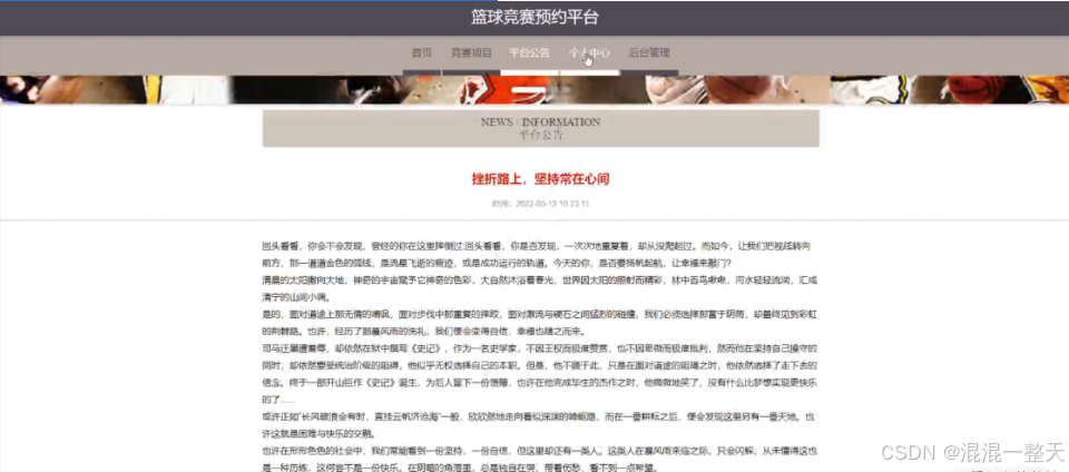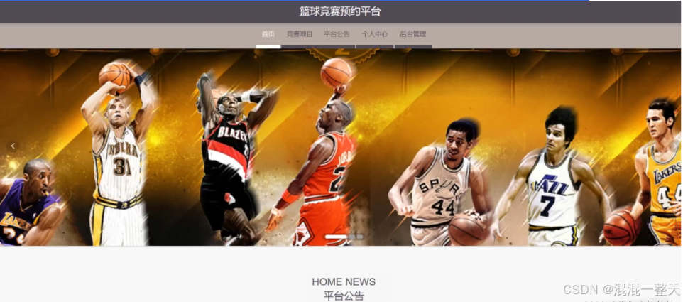 篮球竞赛预约平台,用户进入到平台首页,可以查看首页,竞赛项目,平台公告,个人中心,后台管理等内容进行操作