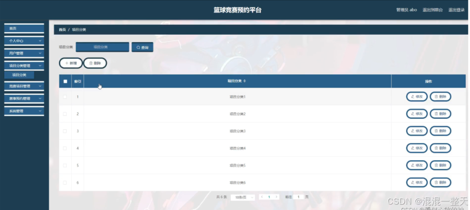 管理员登录进入篮球竞赛预约平台可以查看首页,个人中心,用户管理,项目分类管理,竞赛项目管理,赛事预约管理,系统管理等功能进行详细操作