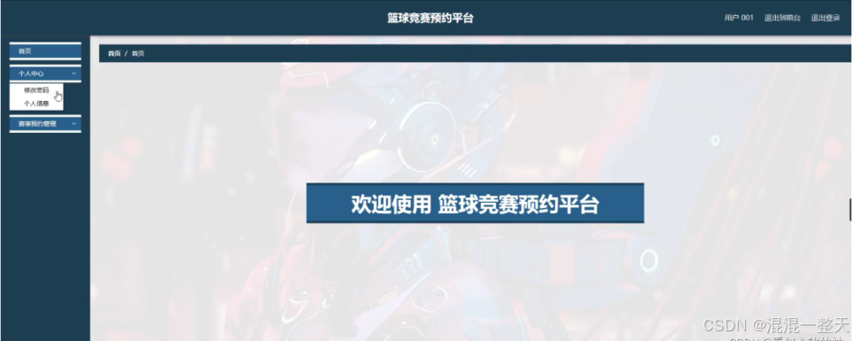 用户登录进入篮球竞赛预约平台可以查看首页,个人中心,赛事预约管理等功能进行详细操作