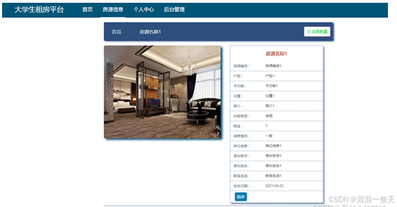 用户进入前台之后可以查看房源详细信息。其页面见下图。用户点击房源的标题即可查看其相关介绍。用户可以收藏房源,或在当前页面点击租房按钮进行租房。