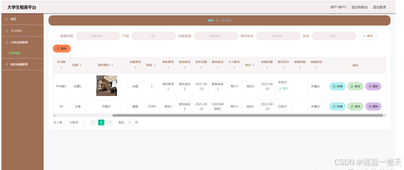 用户进入后台功能操作区之后可以查看订单信息。其页面见下图。用户支付未支付的租房订单,查看租房订单是否通过房东审核。