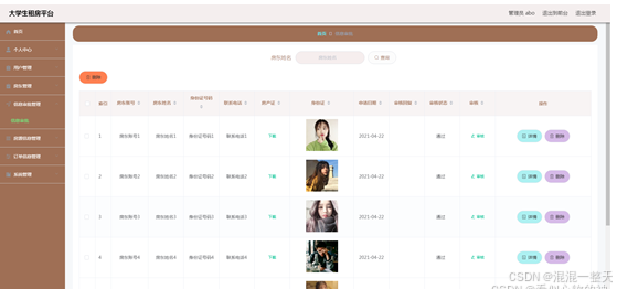 管理员进入指定功能操作区之后可以管理信息审批信息。其页面见下图。房东上传房产证和身份证信息,管理员查看后进行审批,审批通过之后,房东才可以发布房源信息。