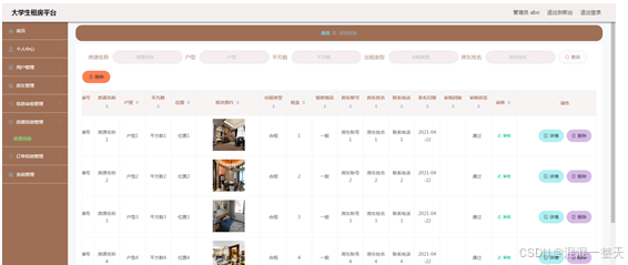 管理员进入指定功能操作区之后可以管理房源信息。其页面见下图。房东发布的房源信息需要先通过管理员的审核,然后才能展示在前台进行出租。