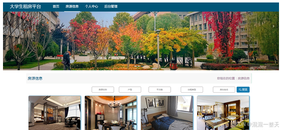用户进入前台之后可以查看房源信息。其页面见下图。本页面显示所有要出租的房源信息,用户可以根据房源名称,户型,出租类型等字段查询所需房源信息。