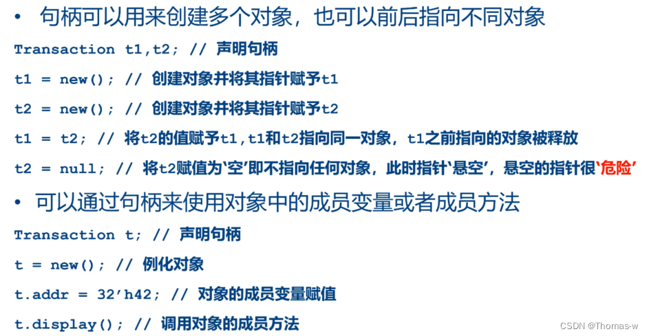 Handle句柄:用来指向对象的指针,Verilog通过层次化的索引找到结构中的设计实例,SV里面通过句柄来索引对象的变量和方法