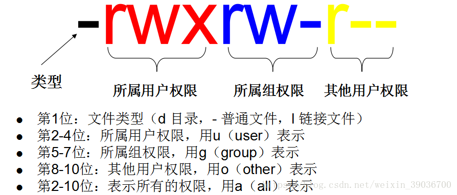 第一部分: 第一位,文件的类型(d目录,-普通文件,l超链接文件)