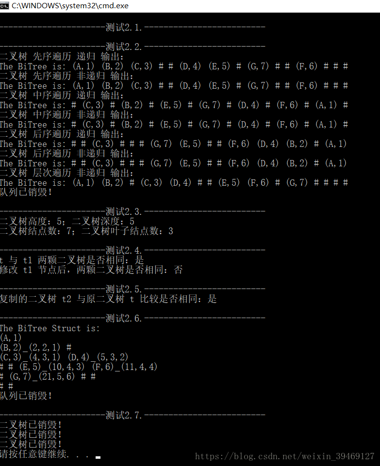 . 注:元素对象需实现 输出操作符 的重载,否则无法打印树结点!